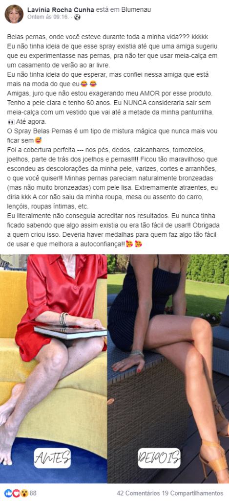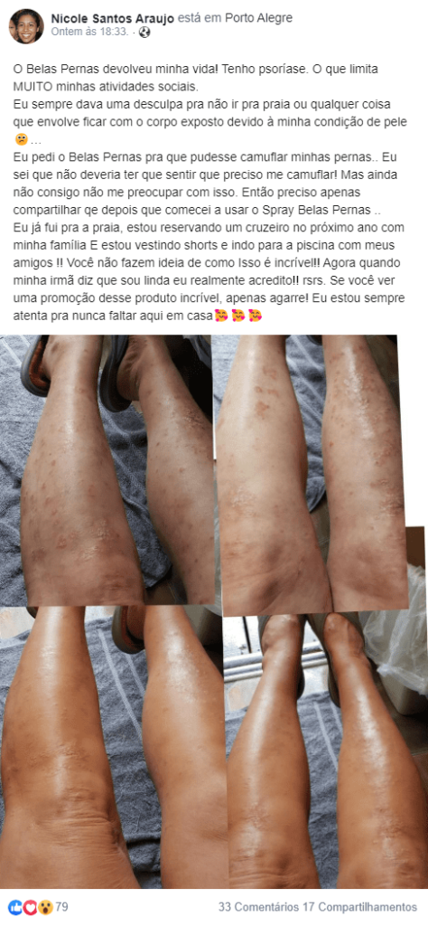 Recomendamos aplicar com a pele limpa e seca. Se desejar, pode aplicar um hidratante antes, mas espere até que seque completamente antes de aplicar o Spray Belas Pernas na pele.